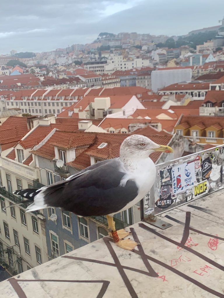 この写真は、リスボンの旧市街で出会った右脚に研究用カラー足環をつけたカモメです。